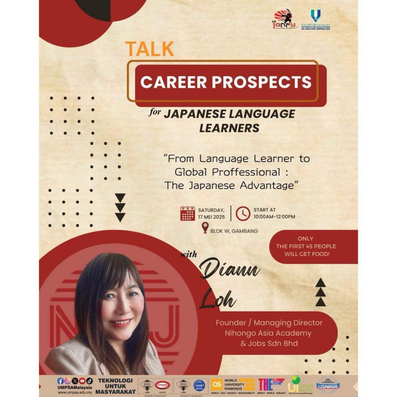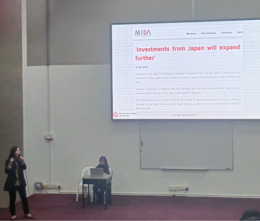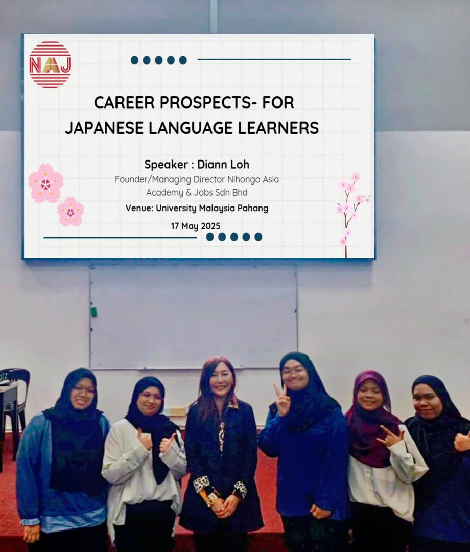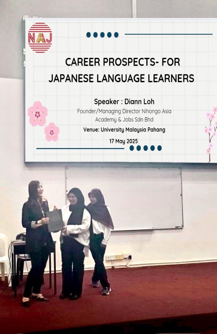 🌸 2025年5月17日、Nihongo Asia Academy & Jobsの創設者兼マネージングディレクターであるDiann Loh氏は、日本語プロフェッショナルクラブ(𝐔𝐧𝐢𝐯𝐞𝐫𝐬𝐢𝐭𝐲 𝐌𝐚𝐥𝐚𝐲𝐬𝐢𝐚 𝐏𝐚𝐡𝐚𝐧𝐠)の招待を受け、「日本語学習者のキャリア展望」と題した講演を行いました。